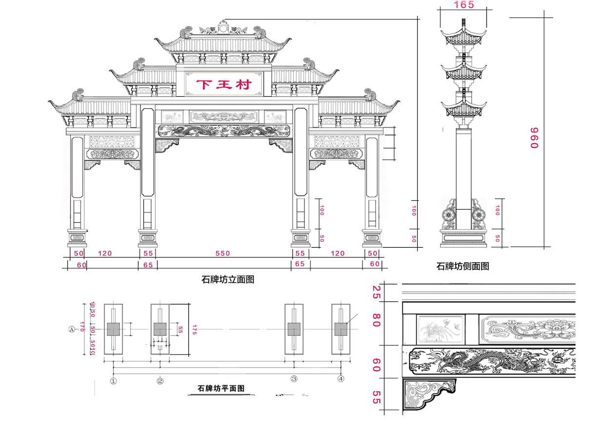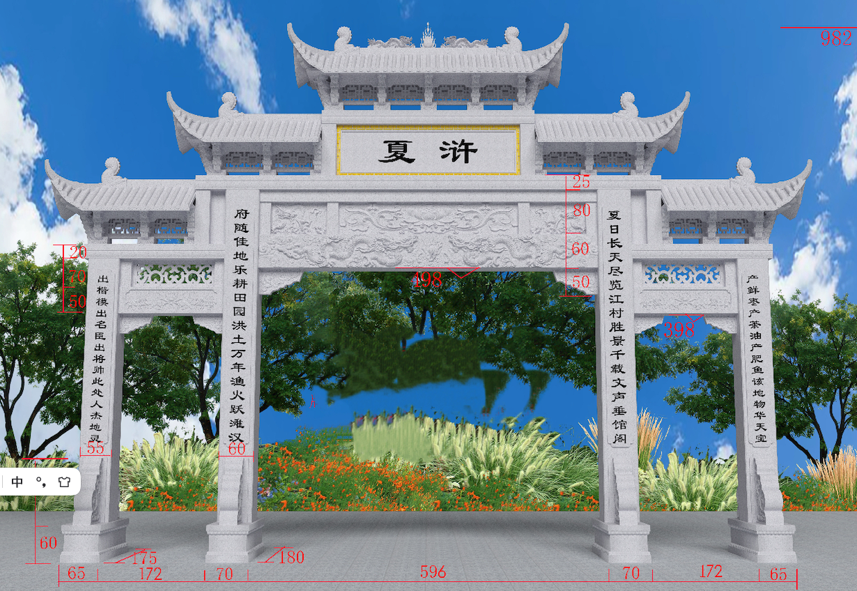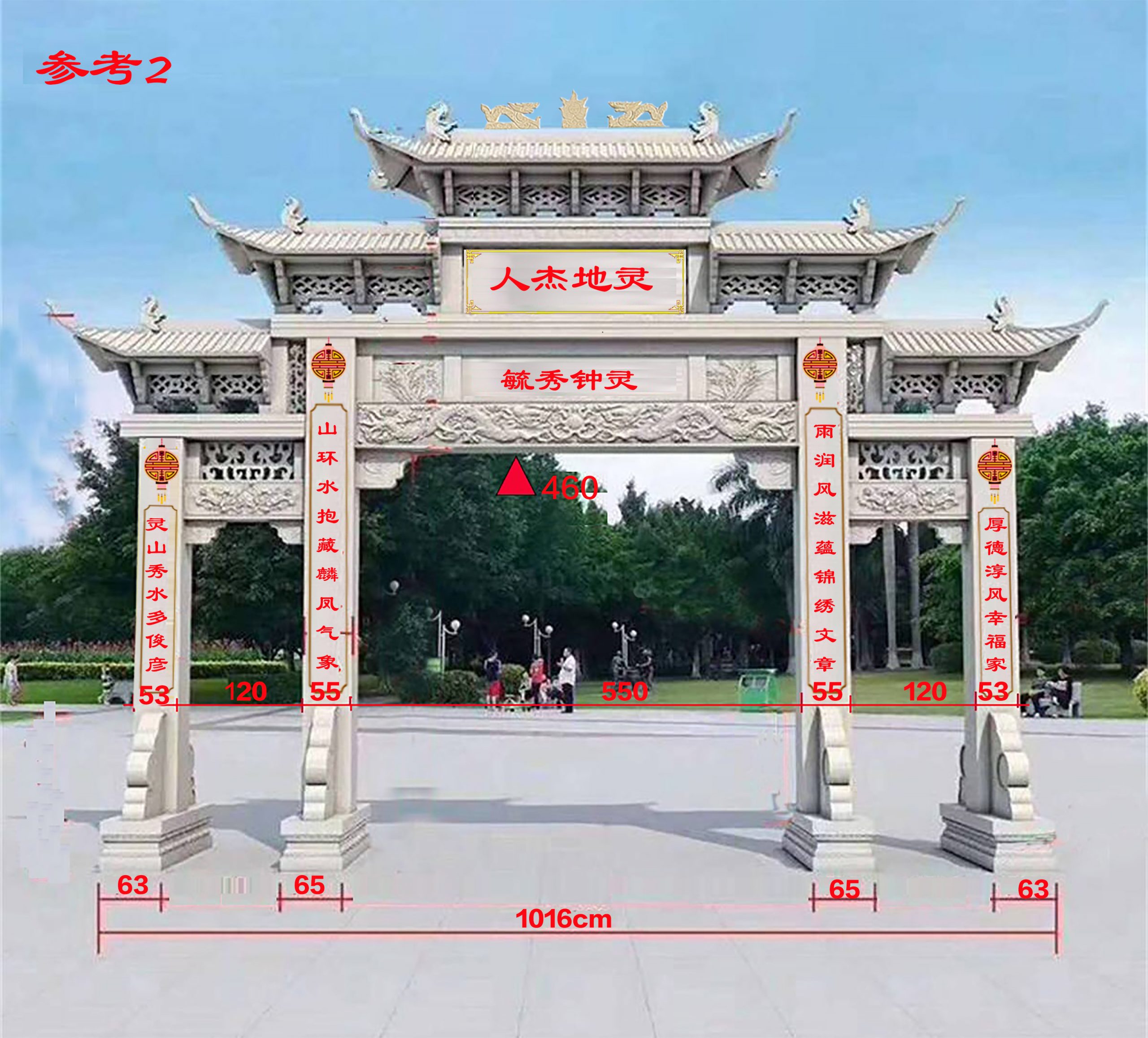 - 下王村牌坊立柱基座最高(5 米),稳定性更强,适配北方多风、地质条件复杂的场景;夏浒牌坊基座最矮,整体视觉更轻盈,适合南方景区、乡村平坦场地安装。